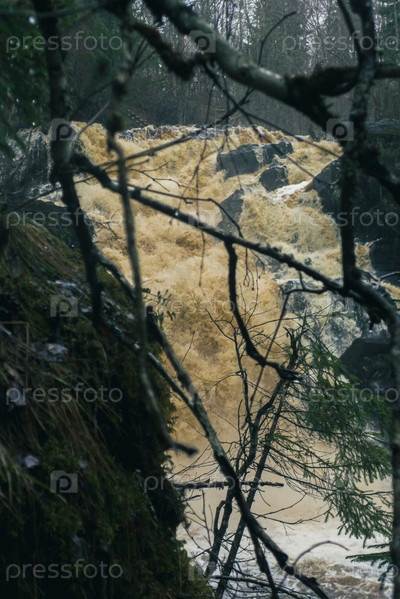 Водопад Белые мосты в лесу Карелии весной