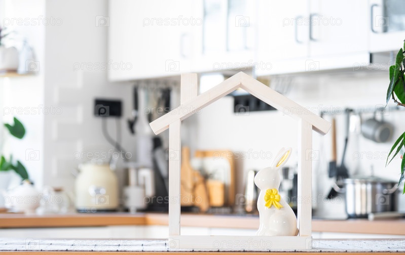 Крошечный уютный домик с пасхальным декором с кроликом и яйцами на кухонном столе. Строительство, дизайн, проект, переезд в новый дом, ипотека, страхование, аренда и покупка недвижимости