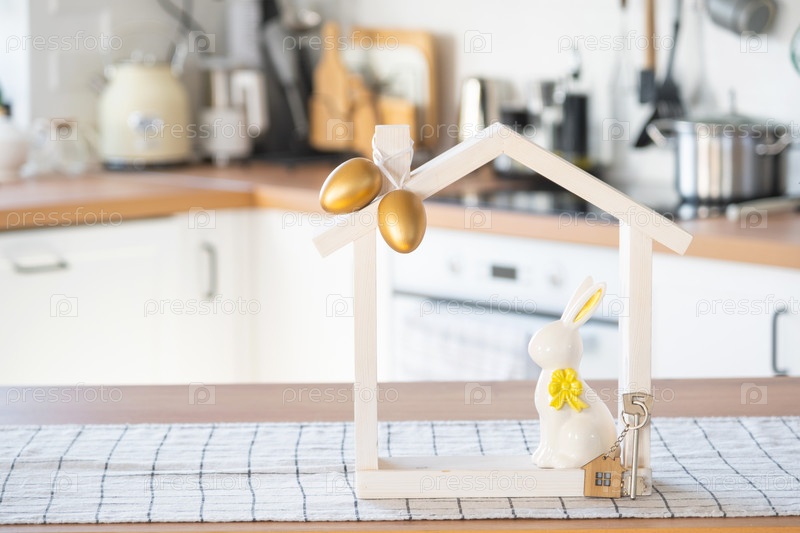 Ключ и крошечный домик уютного дома с пасхальным декором с кроликом и яйцами на кухонном столе. Строительство, дизайн, проект, переезд в новый дом, ипотека, страхование, аренда и покупка недвижимости