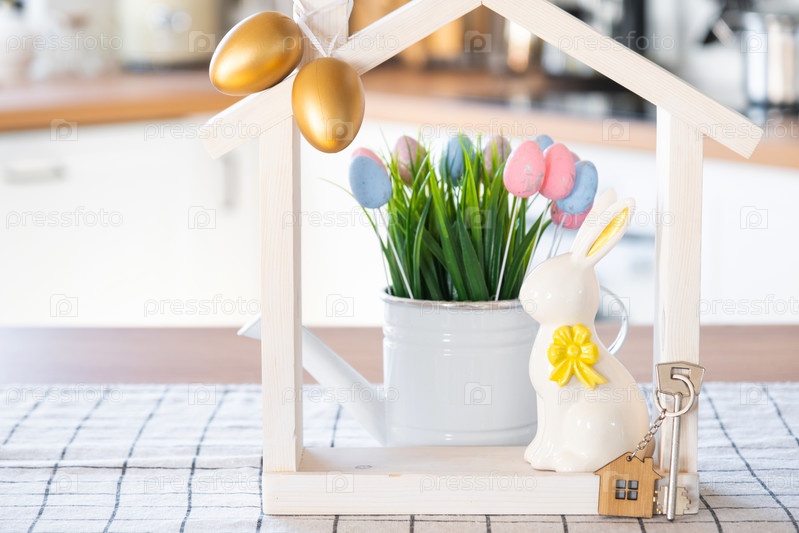 Ключ и крошечный домик уютного дома с пасхальным декором с кроликом и яйцами на кухонном столе. Строительство, дизайн, проект, переезд в новый дом, ипотека, страхование, аренда и покупка недвижимости