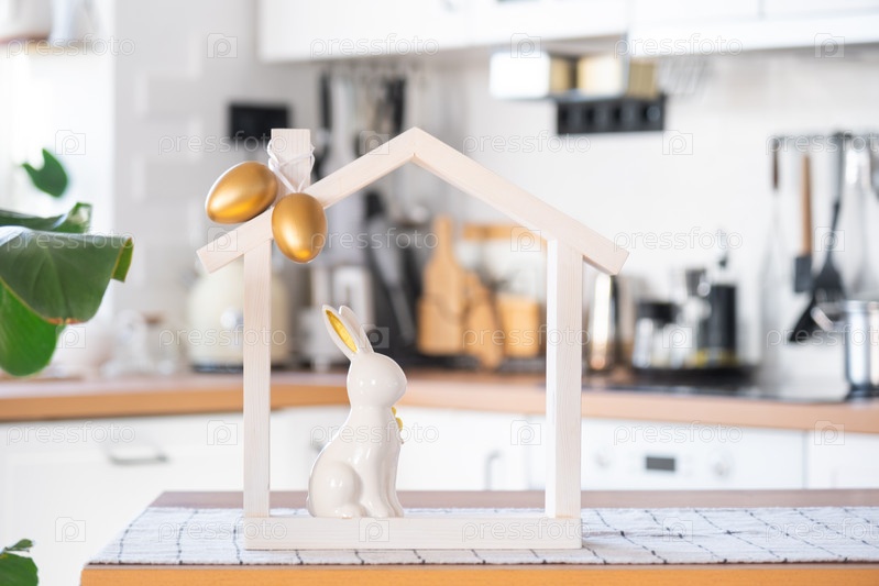 Крошечный уютный домик с пасхальным декором с кроликом и яйцами на кухонном столе. Строительство, дизайн, проект, переезд в новый дом, ипотека, страхование, аренда и покупка недвижимости