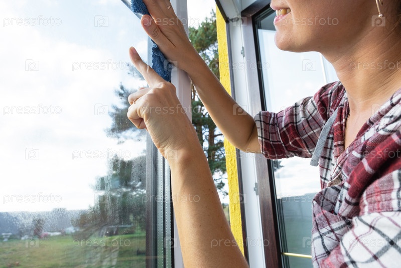 Женщина вручную моет окно дома тряпкой с распылителем и шваброй внутри интерьера с белыми шторами. Наведение порядка и чистоты весной, клининговые услуги