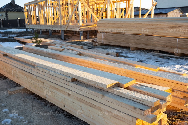Строительство деревянного каркасного дома - каркас из фундамента, стен, крыши на сваях - строительная площадка, процесс строительства каркаса