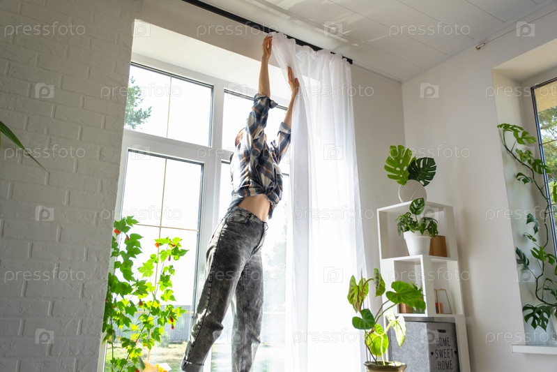 Женщина вешает прозрачные тюлевые шторы на большие окна дома внутри интерьера. Весенняя уборка, наведение порядка