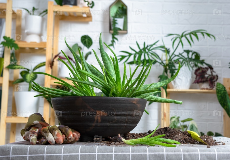 Посадка, пересадка и размножение — это отделение деток растения Алоэ Вера. Суккулент на столе, горшке, почве, совок