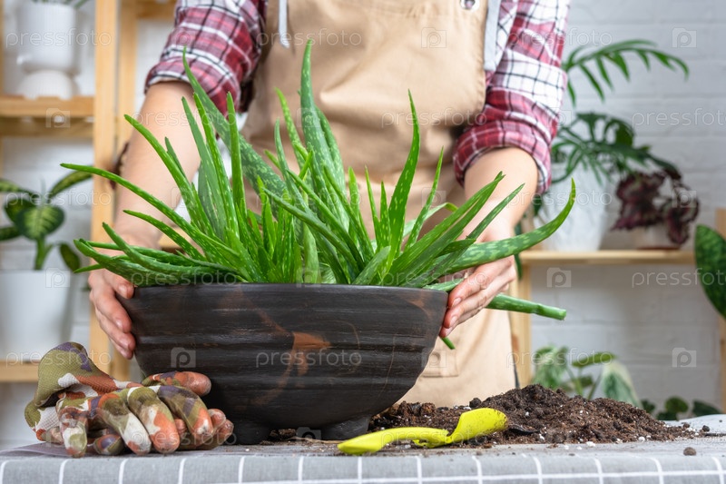 Руки женщины в фартуке. Посадка, пересадка и размножение — это отделение детей растения Алоэ Вера. Суккулент на столе, горшке, почве, совок