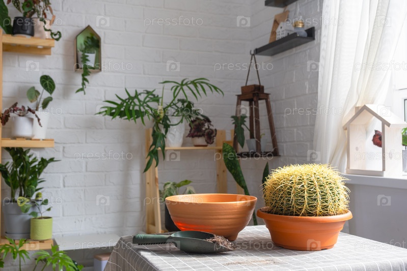 Пересадка выросшего домашнего растения большого колючего кактуса Echinocactus Gruzoni в новый горшок большего размера.Уход за горшечным растением, защитные перчатки, дренаж, горшок, почва, лопата на столе
