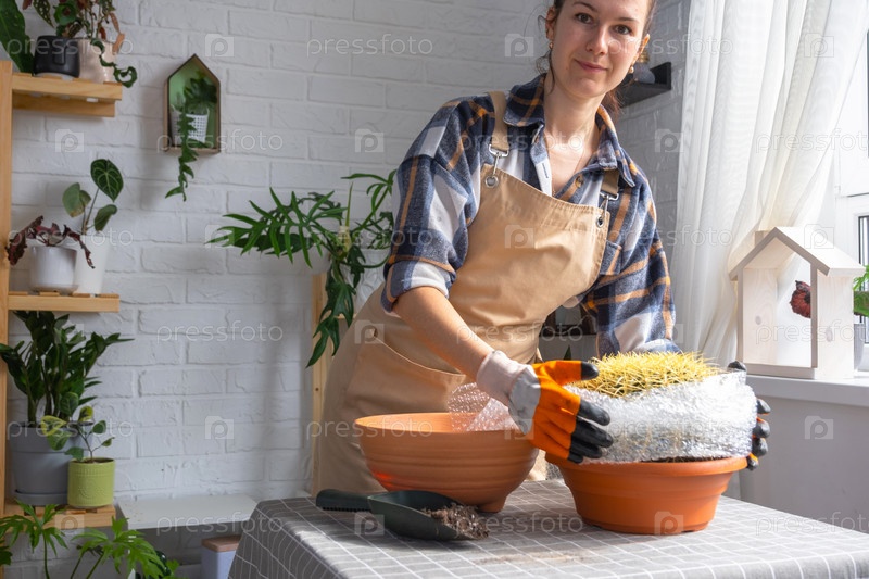 Пересадка выросшего домашнего растения большого колючего кактуса Echinocactus Gruzoni в новый горшок большего размера.Женщина с защитными перчатками обворачивает кактус пузырьковой пленкой, чтобы не попасть под укол