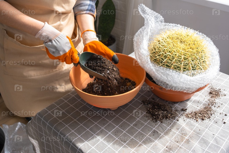 Пересадка выросшего домашнего растения большого колючего кактуса Echinocactus Gruzoni в новый горшок большего размера.Женщина с защитными перчатками обворачивает кактус пузырьковой пленкой, чтобы не попасть под укол