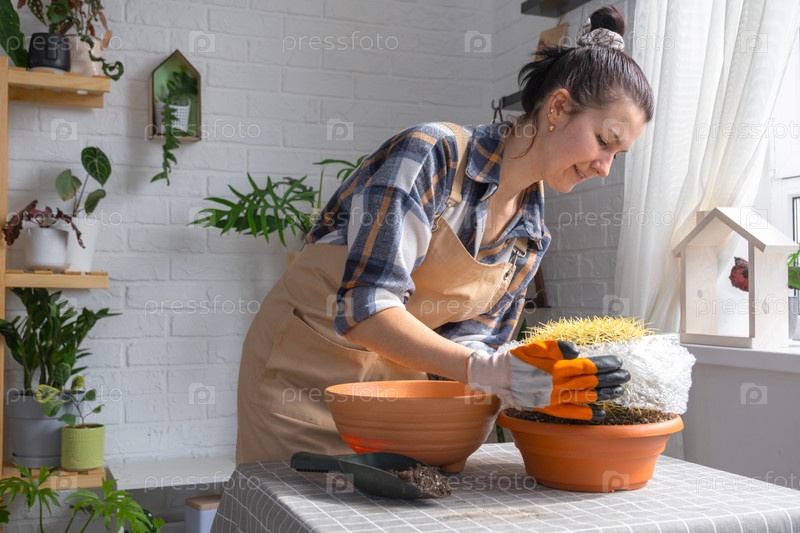 Пересадка выросшего домашнего растения большого колючего кактуса Echinocactus Gruzoni в новый горшок большего размера.Женщина с защитными перчатками обворачивает кактус пузырьковой пленкой, чтобы не попасть под укол