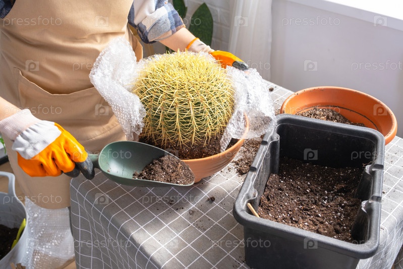 Пересадка выросшего домашнего растения большого колючего кактуса Echinocactus Gruzoni в новый горшок большего размера.Женщина с защитными перчатками обворачивает кактус пузырьковой пленкой, чтобы не попасть под укол
