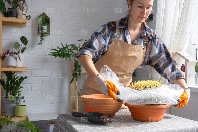 Пересадка выросшего домашнего растения большого колючего кактуса Echinocactus Gruzoni в новый горшок большего размера.Женщина с защитными перчатками обворачивает кактус пузырьковой пленкой, чтобы не попасть под укол