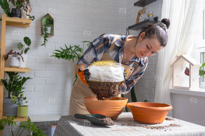 Пересадка выросшего домашнего растения большого колючего кактуса Echinocactus Gruzoni в новый горшок большего размера.Женщина с защитными перчатками обворачивает кактус пузырьковой пленкой, чтобы не попасть под укол