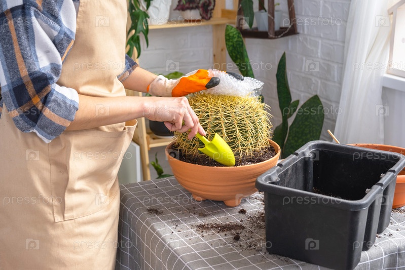 Пересадка выросшего домашнего растения большого колючего кактуса Echinocactus Gruzoni в новый горшок большего размера.Женщина с защитными перчатками обворачивает кактус пузырьковой пленкой, чтобы не попасть под укол