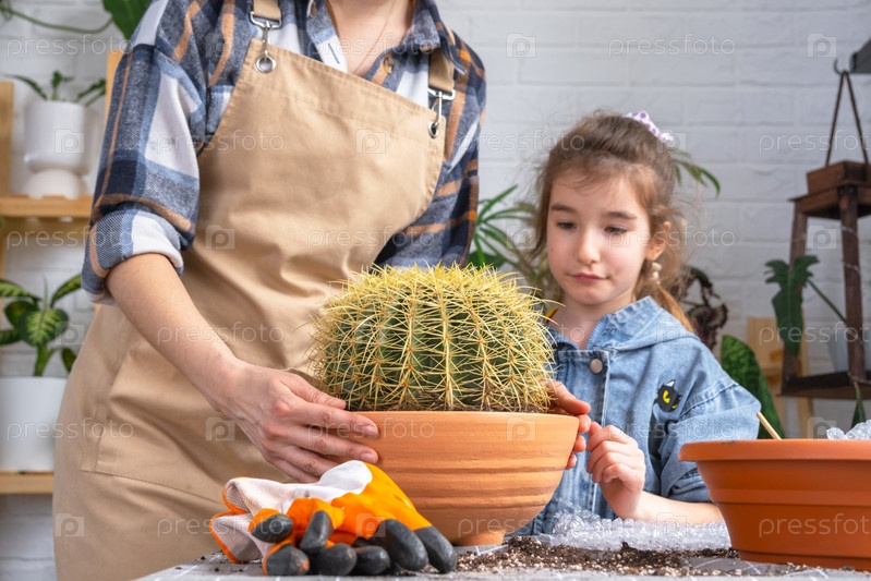Мама и дочь боятся кактуса, девочка касается шиповника Пересадка выросшего домашнего растения большого колючего кактуса Echinocactus Gruzoni в новый горшок большего размера