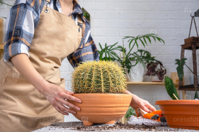 Пересадка выросшего домашнего растения большого колючего кактуса Echinocactus Gruzoni в новый горшок большего размера.Уход за растением в горшке, руки женщины в фартук
