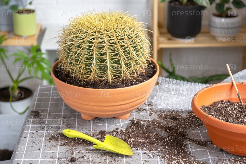 Пересадка выросшего домашнего растения большого колючего кактуса Echinocactus Gruzoni в новый горшок большего размера.Уход за горшечным растением, защитные перчатки, дренаж, горшок, почва, лопата на столе