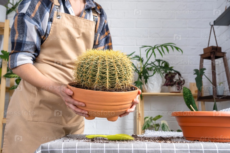 Пересадка выросшего домашнего растения большого колючего кактуса Echinocactus Gruzoni в новый горшок большего размера.Уход за растением в горшке, руки женщины в фартук