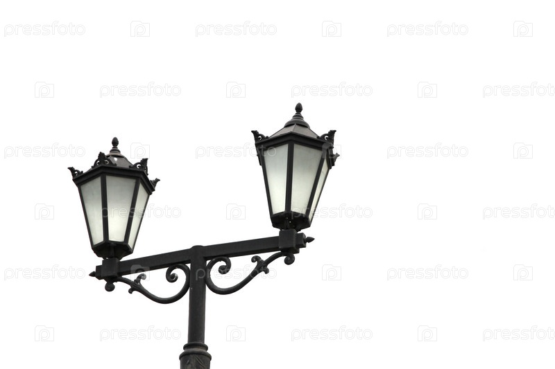 Уличный фонарь с двойными фонарями, освещающими ночь на белом фоне