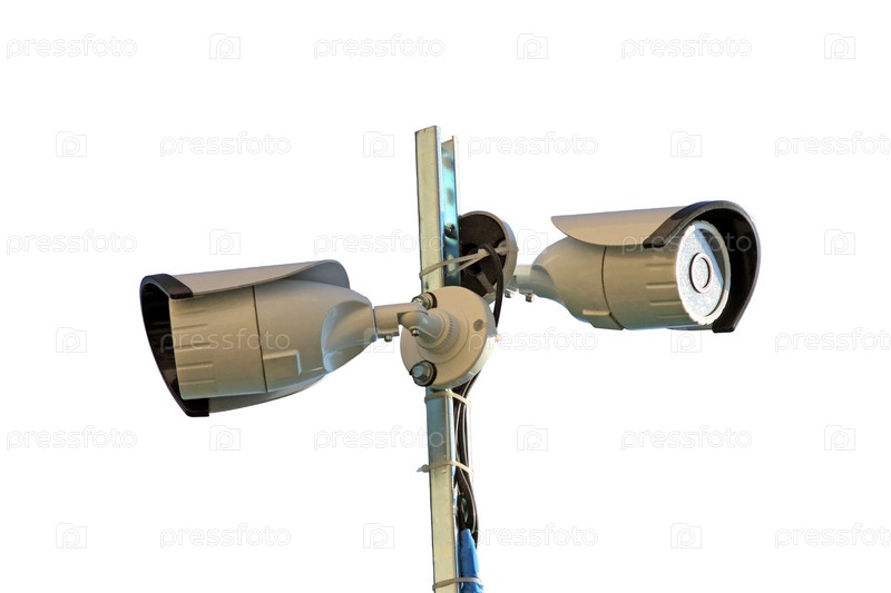 Видеонаблюдение на высоком столбе изолировано на белом фоне