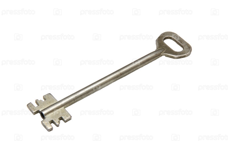 Крупный план ключа, инструмента из никеля или стали, на белом фоне