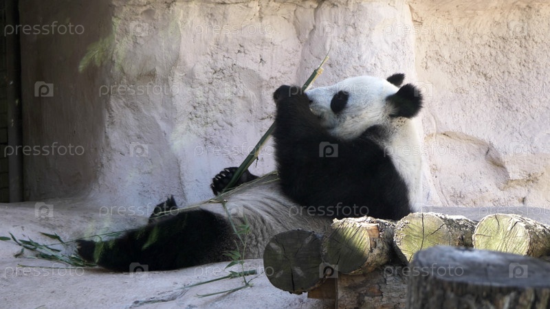 Панда ест на обед сочные бамбуковые ветки