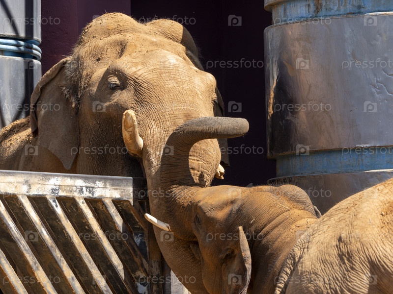 Слоненок держит хоботом матери хобот