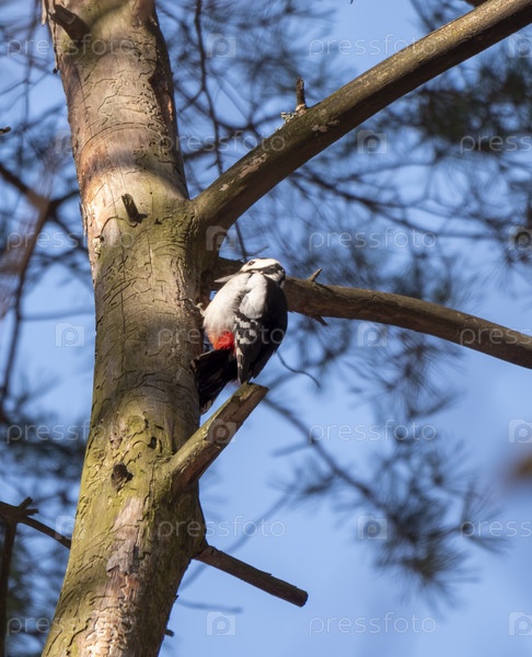 Красивый лесный черепаха Dendrocopos medius на дереве в поисках пищи