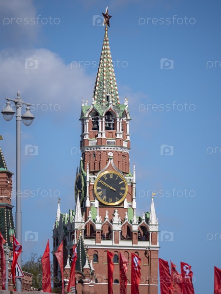 МОСКВА, РОССИЯ, 10 июня 2022 года: Рубиновая звезда на шпиле Спасской башни Московского Кремля 10 июня 2022 года в Москве, Россия