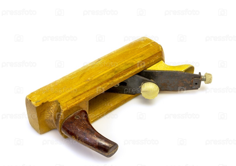Плотник с деревянным строгальным инструментом с изолированным на белом фоне