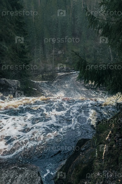 Водопад Белые мосты в лесу Карелии весной