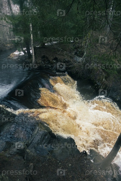 Водопад Белые мосты в лесу Карелии весной