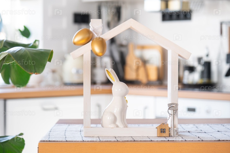 Ключ и крошечный домик уютного дома с пасхальным декором с кроликом и яйцами на кухонном столе. Строительство, дизайн, проект, переезд в новый дом, ипотека, страхование, аренда и покупка недвижимости