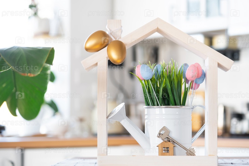 Ключ и крошечный домик уютного дома с пасхальным декором и цветными яйцами на кухонном столе. Строительство, дизайн, проект, переезд в новый дом, ипотека, страхование, аренда и покупка недвижимости