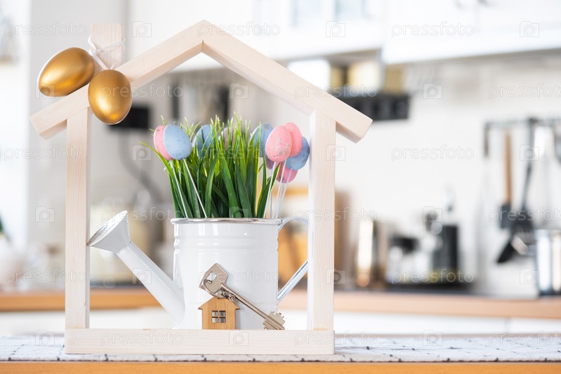 Ключ и крошечный домик уютного дома с пасхальным декором и цветными яйцами на кухонном столе. Строительство, дизайн, проект, переезд в новый дом, ипотека, страхование, аренда и покупка недвижимости