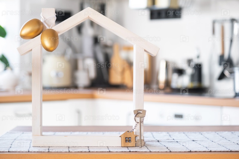 Ключ и крошечный домик уютного дома с пасхальным декором и цветными яйцами на кухонном столе. Строительство, дизайн, проект, переезд в новый дом, ипотека, страхование, аренда и покупка недвижимости