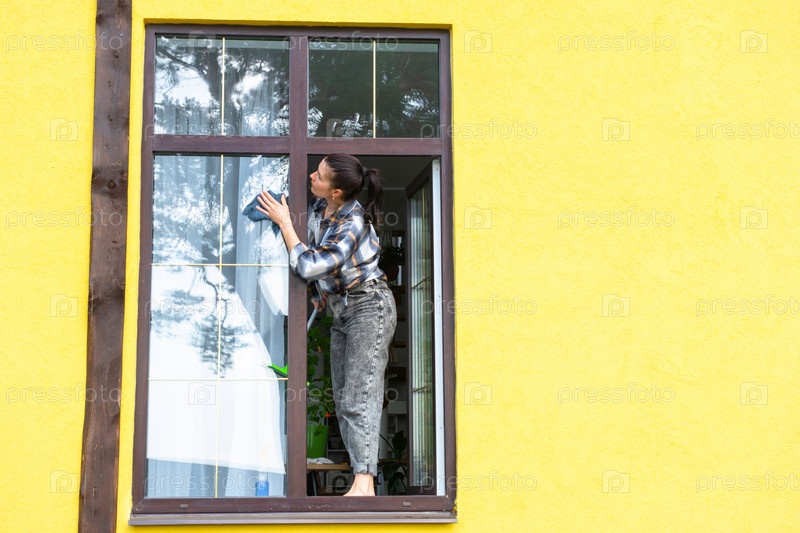Женщина вручную моет окно дома тряпкой с распылителем и шваброй снаружи. Безопасность на высоте, наведение порядка и чистоты весной, клининговые услуги