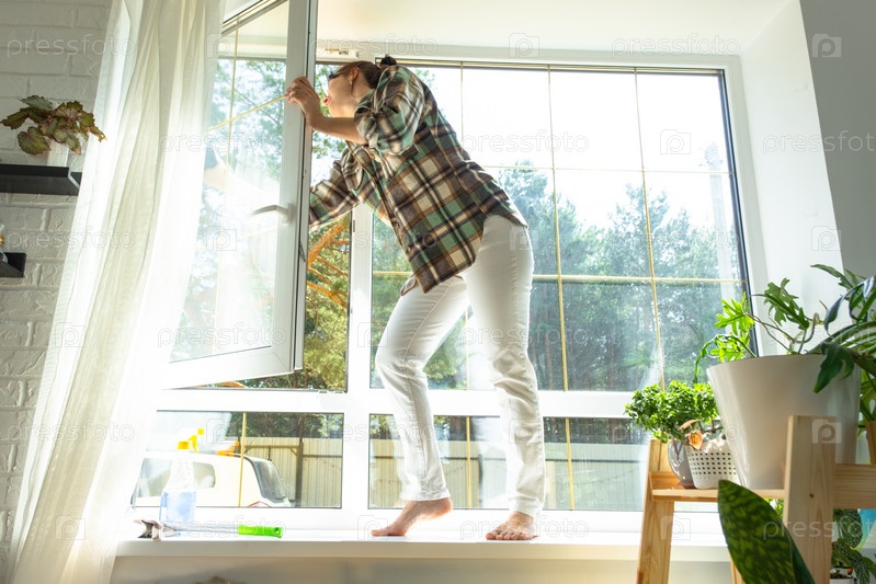 Женщина вручную моет окно дома тряпкой с распылителем и шваброй внутри интерьера с белыми шторами. Наведение порядка и чистоты весной, клининговые услуги