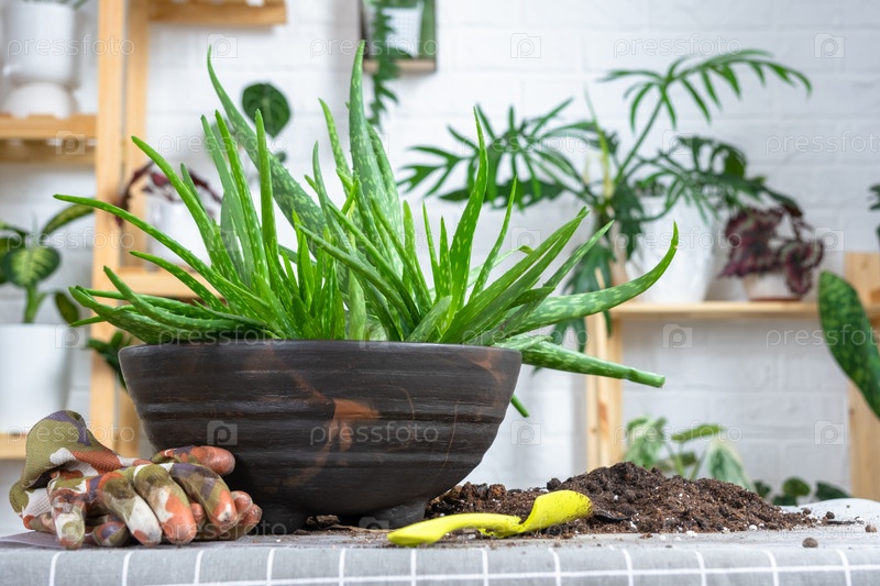 Посадка, пересадка и размножение — это отделение деток растения Алоэ Вера. Суккулент на столе, горшке, почве, совок