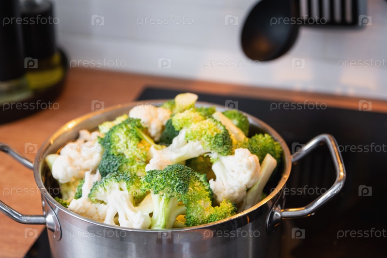 Брокколи и цветную капусту готовят на пару в кастрюле - здоровое питание, детское питание, приготовление в пароварке