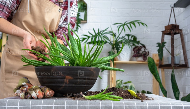 Руки женщины в фартуке. Посадка, пересадка и размножение — это отделение детей растения Алоэ Вера. Суккулент на столе, горшке, почве, совок