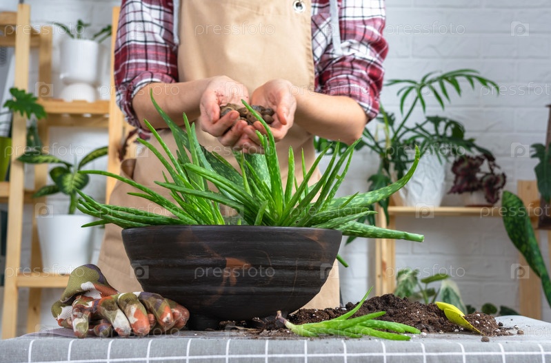 Руки женщины в фартуке. Посадка, пересадка и размножение — это отделение детей растения Алоэ Вера. Суккулент на столе, горшке, почве, совок