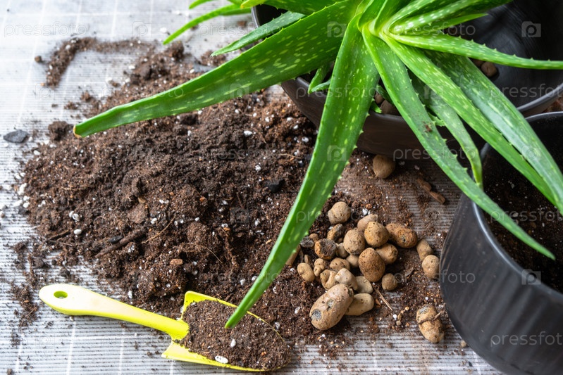 Гранулы керамзита для отвода воды из корневой системы на дно горшка для посадки и пересадки растения Алоэ Вера. Суккулент на столе, горшке, почве, совок