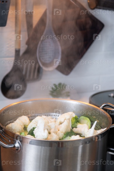 Брокколи и цветную капусту готовят на пару в кастрюле - здоровое питание, детское питание, приготовление в пароварке