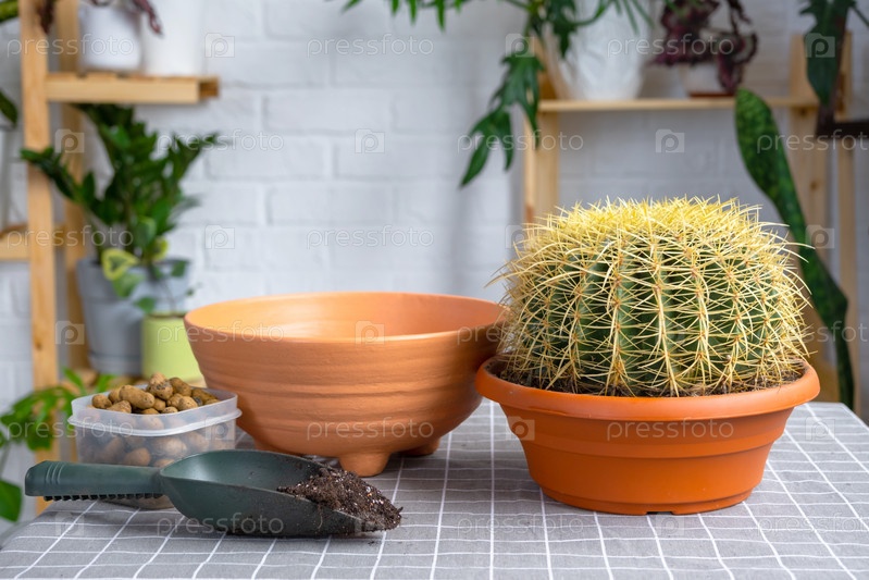 Пересадка выросшего домашнего растения большого колючего кактуса Echinocactus Gruzoni в новый горшок большего размера.Уход за горшечным растением, защитные перчатки, дренаж, горшок, почва, лопата на столе