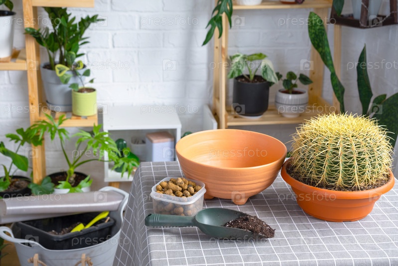 Пересадка выросшего домашнего растения большого колючего кактуса Echinocactus Gruzoni в новый горшок большего размера.Уход за горшечным растением, защитные перчатки, дренаж, горшок, почва, лопата на столе