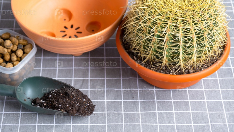 Пересадка выросшего домашнего растения большого колючего кактуса Echinocactus Gruzoni в новый горшок большего размера.Уход за горшечным растением, защитные перчатки, дренаж, горшок, почва, лопата на столе
