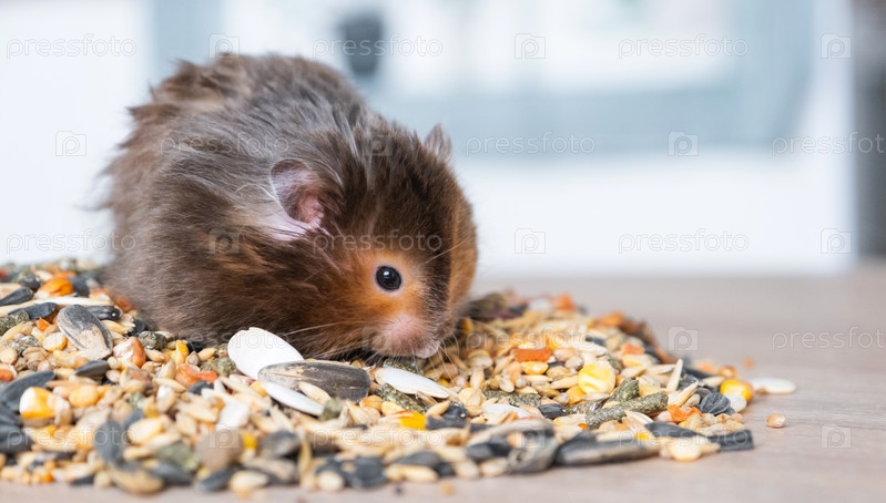 Забавный пушистый сирийский хомяк сидит на пригоршне семян, ест и набивает щеки запасами. Корм для домашних грызунов, витамины. Крупный план