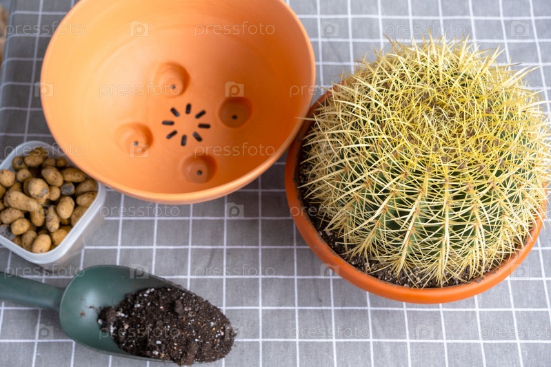 Пересадка выросшего домашнего растения большого колючего кактуса Echinocactus Gruzoni в новый горшок большего размера.Уход за горшечным растением, защитные перчатки, дренаж, горшок, почва, лопата на столе