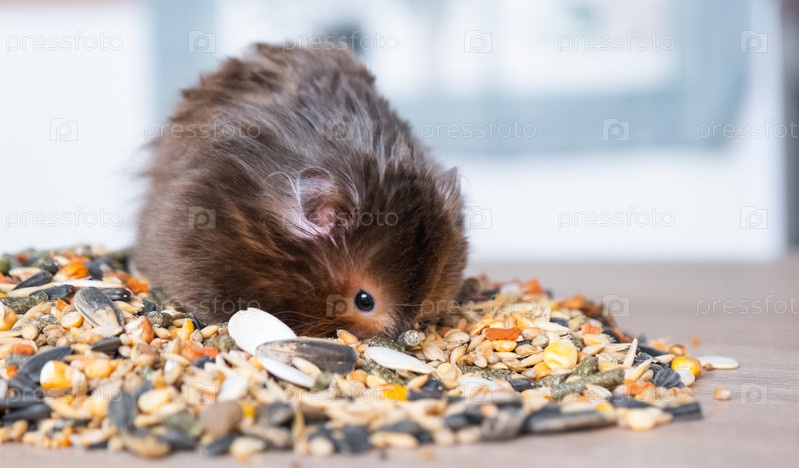 Забавный пушистый сирийский хомяк сидит на пригоршне семян, ест и набивает щеки запасами. Корм для домашних грызунов, витамины. Крупный план